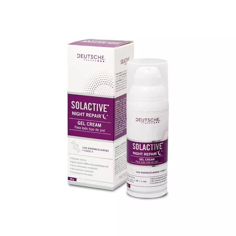 Para Salazar, el Solactive Night Repair de Deutsche Pharma es un producto que vale la pena destacar, porque además de vitamina C “contiene endonucleasas y EGCG-3, que ayudan a reparar el ADN y el daño producido por el sol. Es ideal para personas con alto nivel de fotodaño en la piel”.