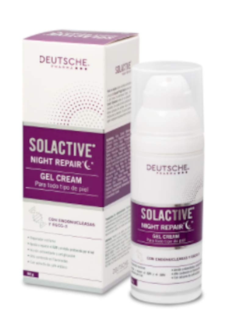 Otro producto que contribuye a despigmentar es la crema-gel nocturna Solactive Night Repair, de Deutsche Pharma, una “infalible” para esta temporada cuando abunda el sol y el calor. “Tiene enzimas, como las endonucleasas y ECGC-3, que ayudan a reparar el ADN de la piel dañada por la radiación UV”, puntualiza la interna de medicina. “Al tener antioxidantes, nos protege contra el estrés oxidativo, ayuda a despigmentar y prevenir líneas de expresión”.