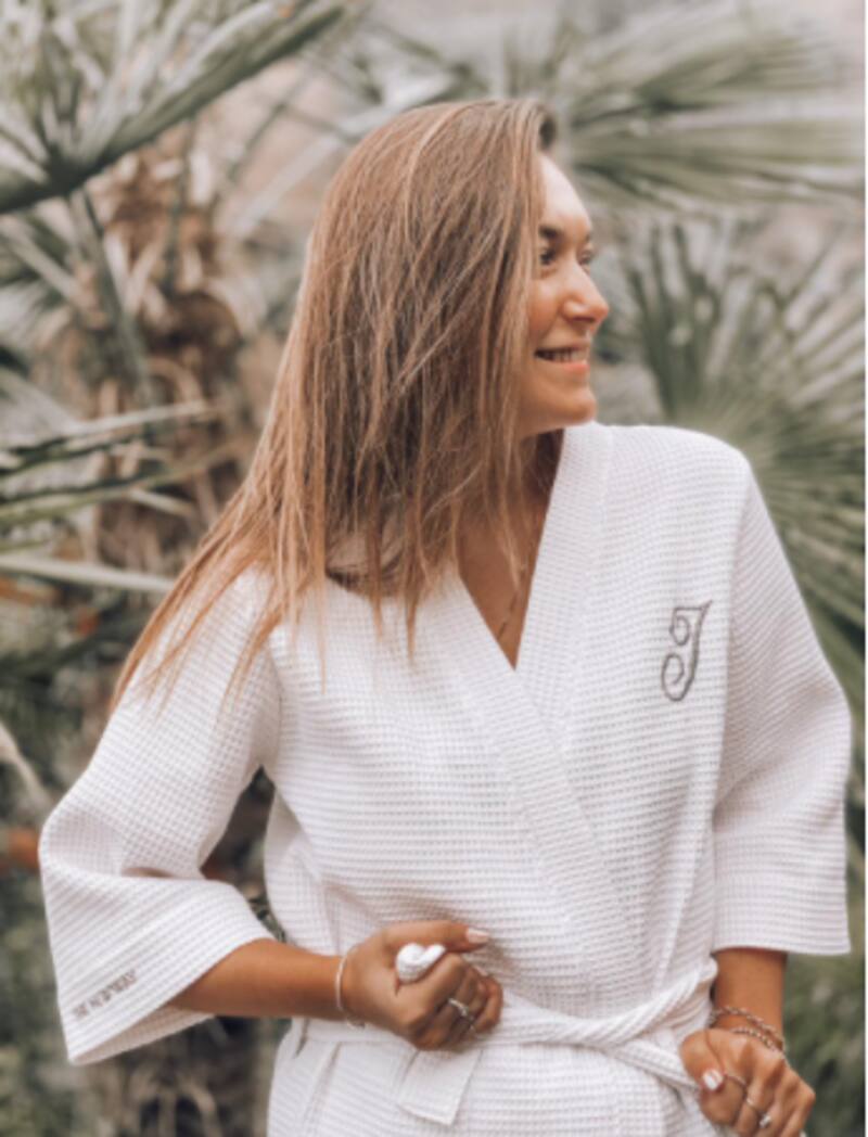 Y para tener la experiencia spa en su máxima expresión, la creadora de The New Way sugiere su propia bata spa, la que puede ser personalizada con tu inicial. “Al ponértela es como que te teletransportas a un spa de lujo, mientras haces tu rutina cómoda, con una tela fresca y de extrema calidad”, añade.