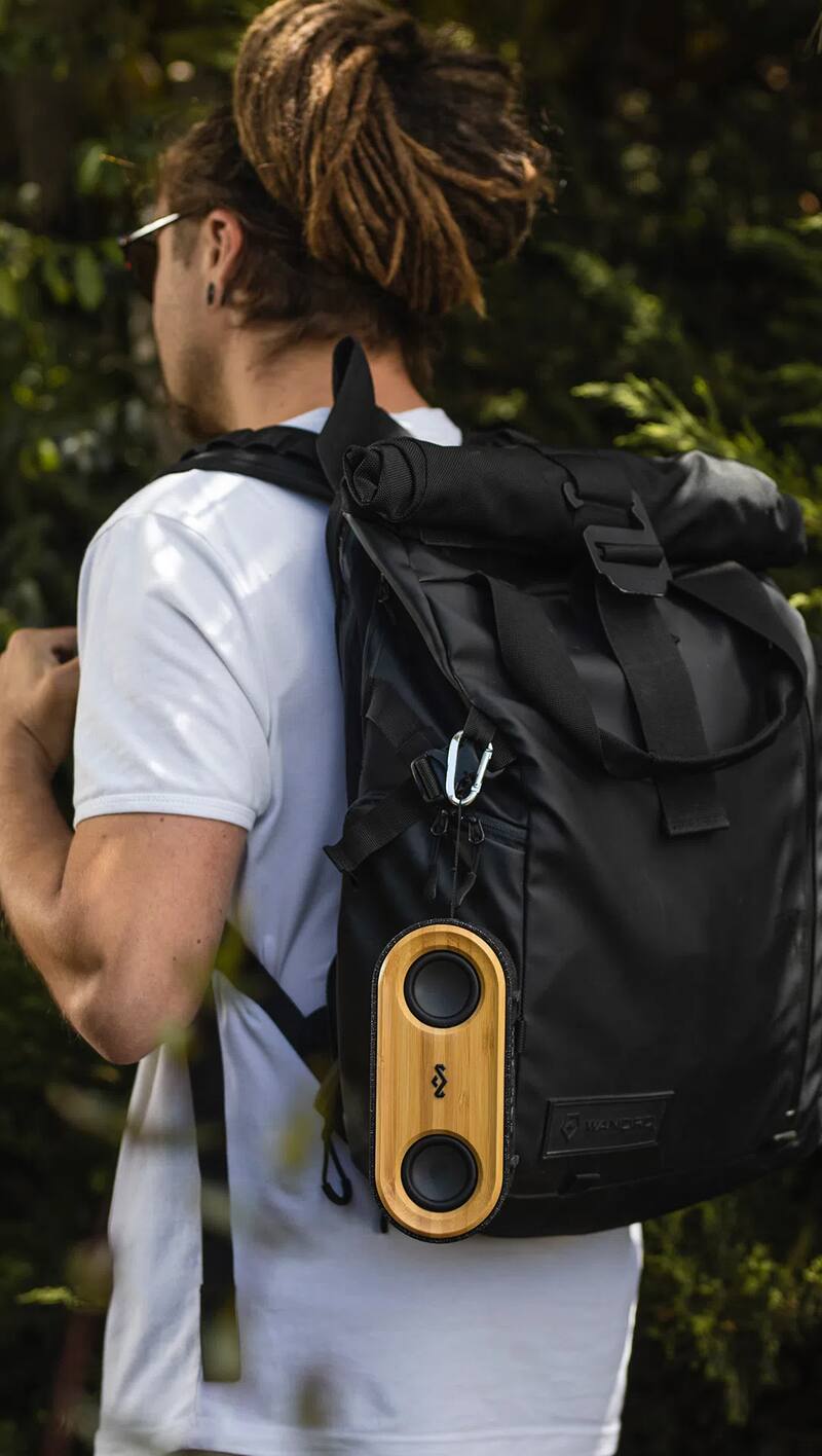 El encendido y apagado se hace desde la botonera ubicada en la cara trasera del parlante, oscura y de un material similar al caucho —seguramente producido en base a los materiales reciclados expuestos al comienzo—, con dos áreas delineadas, una de las cuales esconde el puerto para carga y una entrada auxiliar minijack para insertar una fuente de audio análoga (como un viejo reproductor de CD o mp3).