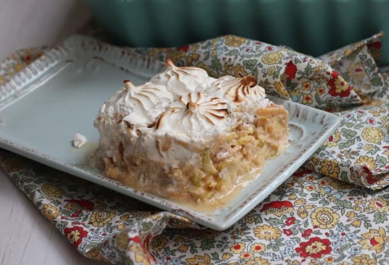 Poner el merengue encima de la manzana con leche condensada y llevar nuevamente al horno —ojalá con grill— por diez minutos o hasta que el merengue comience a dorar. Sacar del horno, dejar enfriar y servir.