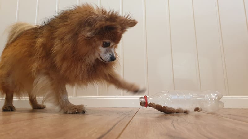 Tu juguete dispensador de comida ya está listo para ser sometido a prueba. Observa cómo se comporta tu perro con él. La idea es que tenga cierta dificultad para conseguir el alimento, pero también que los pellets eventualmente caigan. Sino, puede generarle frustración y no volver a interesarse por tu invento.
