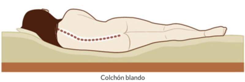 - En un colchón demasiado blando, el cuerpo tiende a hundirse. Esto presenta distintos problemas: la sensación de calor aumenta, porque no circula el aire, y por otro lado la columna vertebral y la espalda no están bien sujetas, ni al dormir boca arriba, ni de lado.