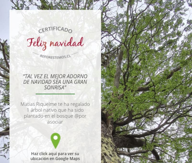 Si te animaste a regalar un árbol, en el sitio de Reforestemos lo puedes comprar y se le enviará un certificado de regalo a la persona, el que indica las coordenadas exactas de dónde se ubicará su árbol a través de un link georeferenciado en Google Maps. En el sitio expresan que “los árboles que plantes pueden estar reunidos en un bosque virtual que puedes hacer crecer con el tiempo, sumando nuevos árboles o invitando a tus amigos a plantar en él”.