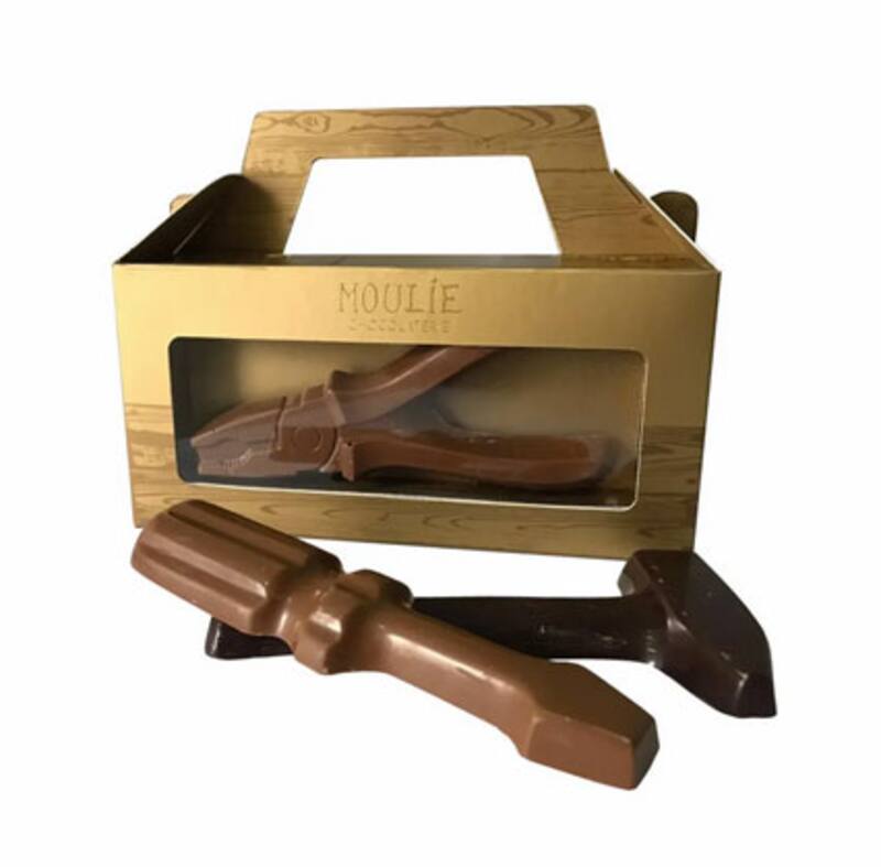 Puede funcionar como un regalo simbólico, para esos padres aficionados a las herramientas y los arreglos domésticos, y también como un obsequio irónico para los papás que no saben ni clavar un clavo. Como sea, esta caja es del maravilloso chocolate Moulie.