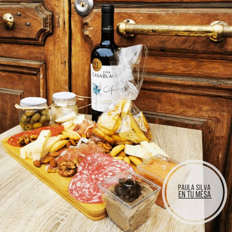 Salame, salamín, lomo kassler, lomo lachs, jamón serrano, queso de fundo con merkén y ciboulette, queso de cabra, paté coñac con cebolla caramelizada, paté de nuez, almendras saladas, nueces caramelizadas, aceitunas verdes, huevos de codorniz encurtidos, tostadas y una botella de vino. ¡Hasta la tabla de madera viene incluida!