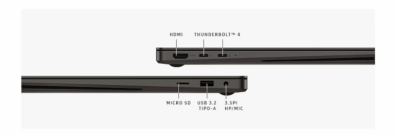 - Puertos: 1 HDMI 2.0 / 2 Thunderbolt 4 / 1 USB-C 3.2 / Lector MicroSD / 1 salida de auriculares/Mic-in