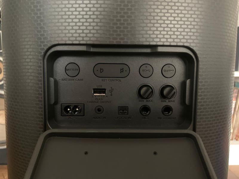 Todas éstas se ubican en un panel trasero, donde además se encuentran los botones físicos de otras modalidades como la de Battery Care (o ahorro de energía). En este mismo puerto se encuentran dos entradas más: la destinada para instrumentos como una guitarra eléctrica y la disponible para un micrófono. Porque, ¡¿qué es una fiesta sin karaoke?!