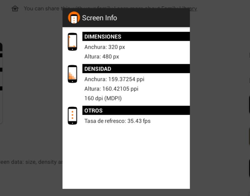 Otra opción gratuita es Screen Info, una app dedicada exclusivamente a dar información respecto a la pantalla de nuestro teléfono móvil. Tiene más de 100 mil descargas y una evaluación promedio de 5 estrellas, algo que consigue porque solo cumple lo que promete: entregar las dimensiones, la densidad y la tasa de refresco del celular. Fácil y rápido.