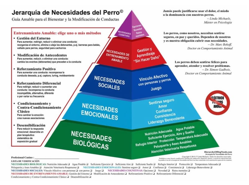 Para entender este punto, podemos basarnos en la pirámide de necesidades del perro, creada por la adiestradora canina Linda Michaels. En la base están sus necesidades biológicas (nutrición adecuada, agua, ejercicio, refugio, etc), seguidas por sus necesidades emocionales (sentirse seguro, amor, confianza, liderazgo). Más arriba están las necesidades sociales (como el juego y el vínculo afectivo con personas y perros), y sobre ellas la necesidad de entrenamiento amable (gestión y aprendizaje de forma amable). En la cima se ubican las necesidades cognitivas (novedades, retos mentales, opciones). Puede ser que algunos de estos puntos estén deficientes, y por ende, el perro lo exprese a través del ladrido.