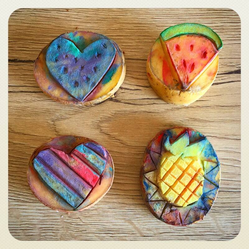 Un clásico que nunca pasa de moda, muy fácil de hacer. El adulto o cuidador debe partir por la mitad un par papas y tallar cada una con diferentes formas, como corazones, círculos, letras, estrellas o lo que se les ocurra junto a los niños. “Eso les permitirá estampar y armar sus creaciones como se les antoje”, dice Woldarsky. Entre más grandes sean los niños, más elaborados pueden ser los diseños.