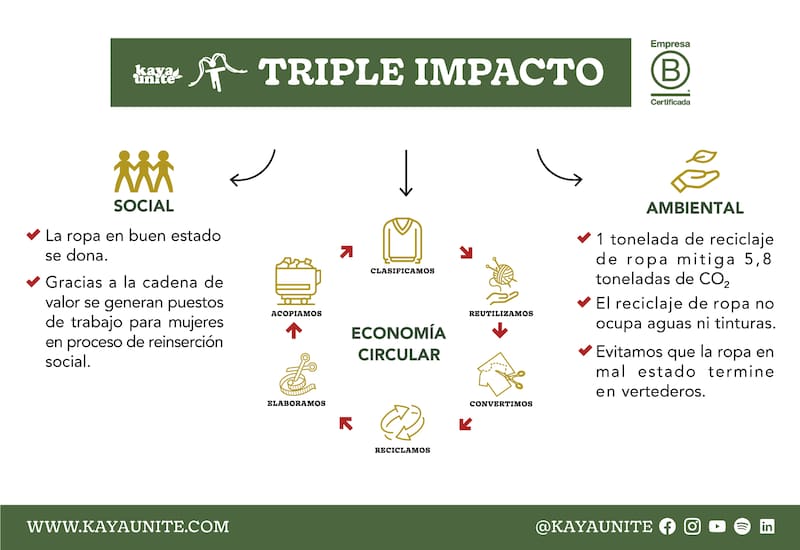 El proyecto ideado por Kaya Unite, ha sido apoyado por la Municipalidad de Las Condes y acompañado por el emprendimiento de reciclaje textil Ecocitex. Este punto limpio, tiene la capacidad de recibir ropa en buen y mal estado, trayendo consigo una serie de beneficios de triple impacto: