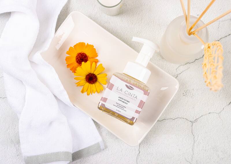 Espuma de Higiene Íntima, hecha de aceite de arroz (hidratante y antioxidante), extracto de caléndula (reparador de la piel) y femitin (extracto herbal regulador natural del pH fisiológico);