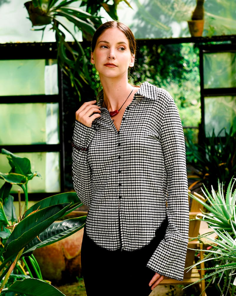 Las opciones con amarras o estampados clásicos, como el cuadrillé, hacen un excelente contraste con el denim. Combinadas con unos jeans de corte recto, logran una estética fresca y perfecta para un panorama de fin de semana.