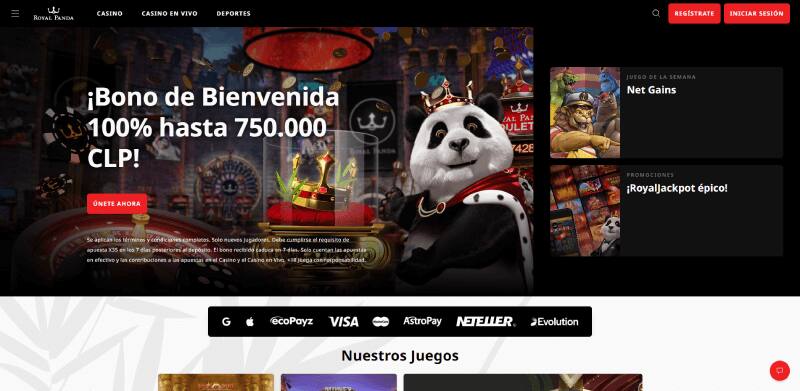 Royal Panda te da la bienvenida a su casino, con un bono que te otorga el 100% de tu primer depósito hasta un máximo de CLP $750.000, para que juegues y apuestes con ventaja. Adicionalmente, podrás optar por ingresar o retirar dinero en la plataforma en un buen número de opciones de pago, desde billeteras internacionales, hasta depósitos en pesos chilenos.