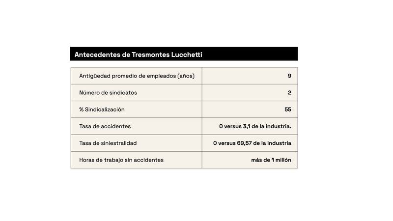 En el caso de Tresmontes Lucchetti, se reconoce su labor en materias de seguridad y prevención de riesgos, con altos estándares globales que, incluso, la llevaron a ser premiada por la ACHS, en abril de este año, por alcanzar más de 1 millón de horas de trabajo sin accidentes.