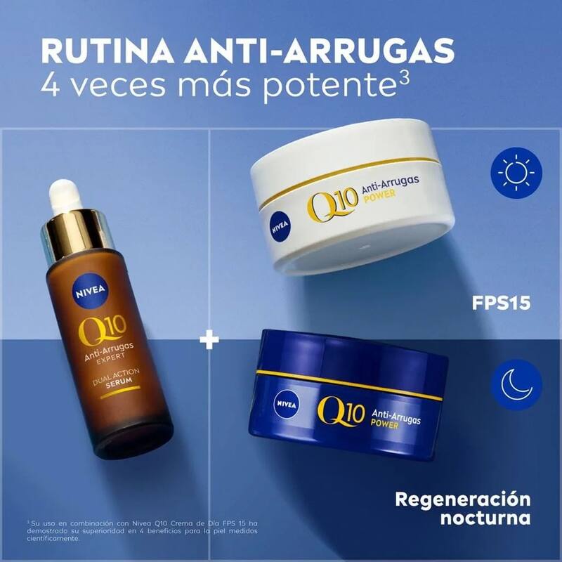 ⁴ El uso en combinación con NIVEA Q10 Crema de Día FPS 15 demostró superioridad en 4 beneficios de la piel medidos científicamente. Estudio instrumental, Beiersdorf AG.