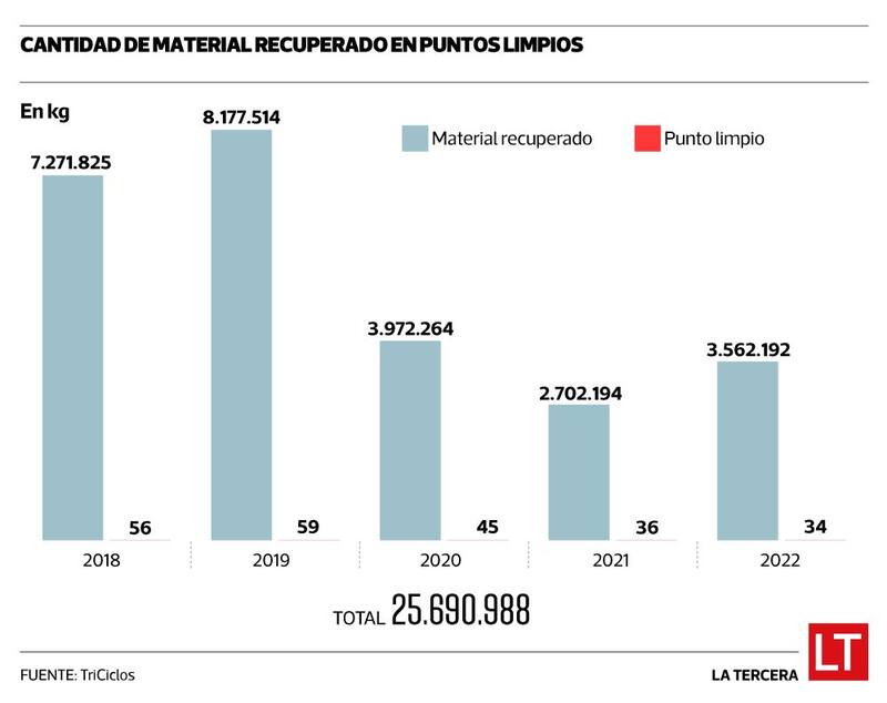 El reciclaje en puntos limpios aumentó un 32% (a 3.562.192 kilos) el 2022, con respecto al año anterior, según un estudio de TriCiclos, que analizó los 34 lugares para este fin que tiene de Arica a Chiloé. Si bien la cifra es positiva, aún no supera lo obtenido en 2020, donde se consiguió casi cuatro millones de kg y está muy por debajo de los niveles prepandemia. En 2019 se lograron 8.177.514 kg., o sea más del doble del año pasado.