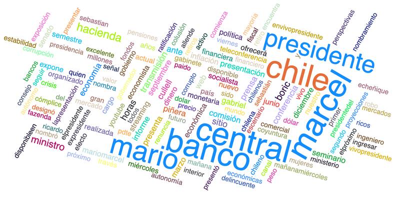 Un segundo conjunto de palabras da cuenta también de la constante preocupación de Marcel por informar a la población lo que acontece en materia económica. Palabras clave son aquí: “presentación”, “coyuntura”, “prensa”, “teleconferencia”, “seminario”, “presenta”, “streaming”, “exposición”. Si la comunicación pública fue relevante para el expresidente del Banco Central, esperemos que lo sea también con más fuerza en su rol de ministro de Hacienda.