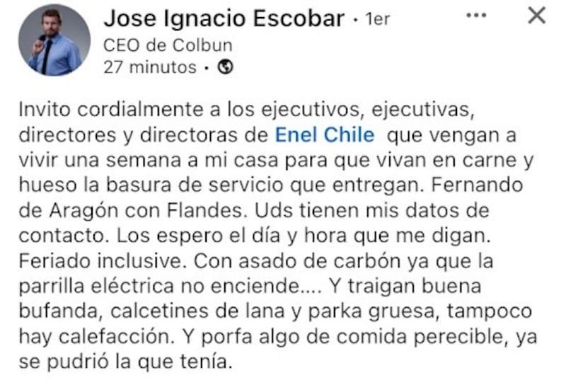 “Invito cordialmente a los ejecutivos, ejecutivas, directores y directoras de Enel Chile que vengan a vivir una semana a mi casa para que vivan en carne y hueso la basura de servicio que entregan”, comenzó diciendo Escobar, en el primero de sus incendiarios posteos, en el que daba algunas coordenadas de la ubicación del domicilio, pero que luego eliminó. Agregó, en tono irónico, que los esperaba “con asado a carbón ya que la parrilla eléctrica no enciende… y traigan una buena bufanda, calcetines de lana, parka gruesa” por la falta de calefacción”, junto con solicitar comida perecible porque “se pudrió la que tenía”.