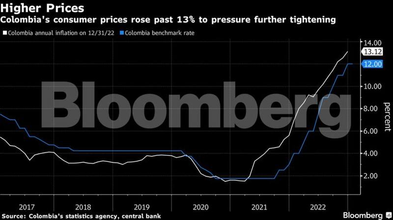 El índice de precios al consumidor se elevó un 13,12% en diciembre con respecto a un año antes, a su nivel más alto desde 1999, informó el jueves la agencia nacional de estadísticas DANE. El resultado superó las previsiones de los 19 economistas encuestados por Bloomberg. Los precios aumentaron un 1,26% frente al mes anterior.