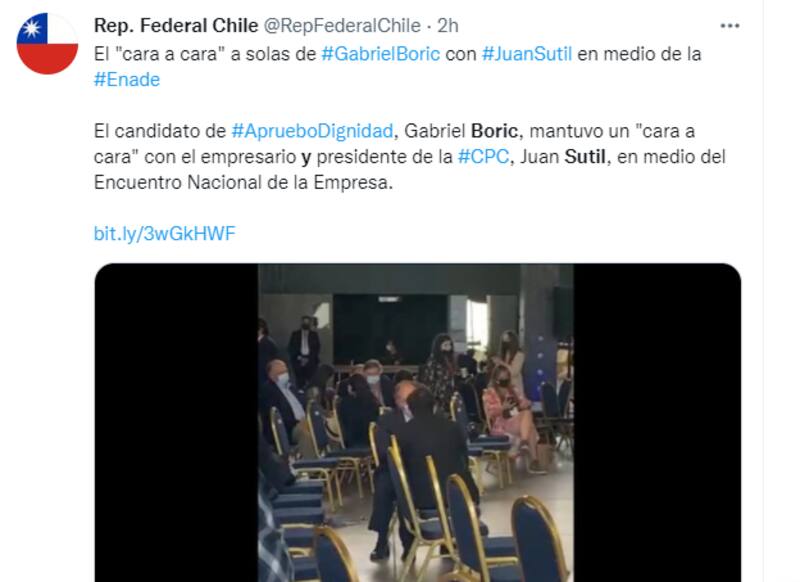 Durante el día de ayer y tras una extensa jornada de exposiciones y debates en el Encuentro Nacional de la Empresa (Enade) 2021, se viralizó en redes sociales una imagen en la cual Juan Sutil, presidente de la Confederación de la Producción y del Comercio (CPC), y Gabriel Boric, candidato a La Moneda por Apruebo Dignidad, mantenían una conversación en privado, apartados del resto de los presidenciables que asistieron al evento.