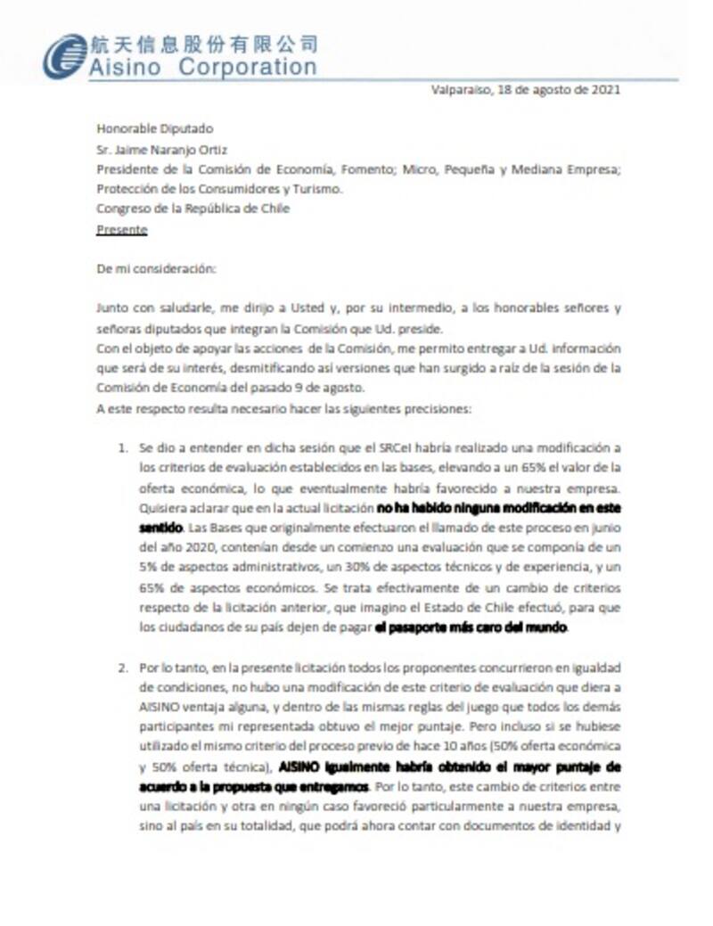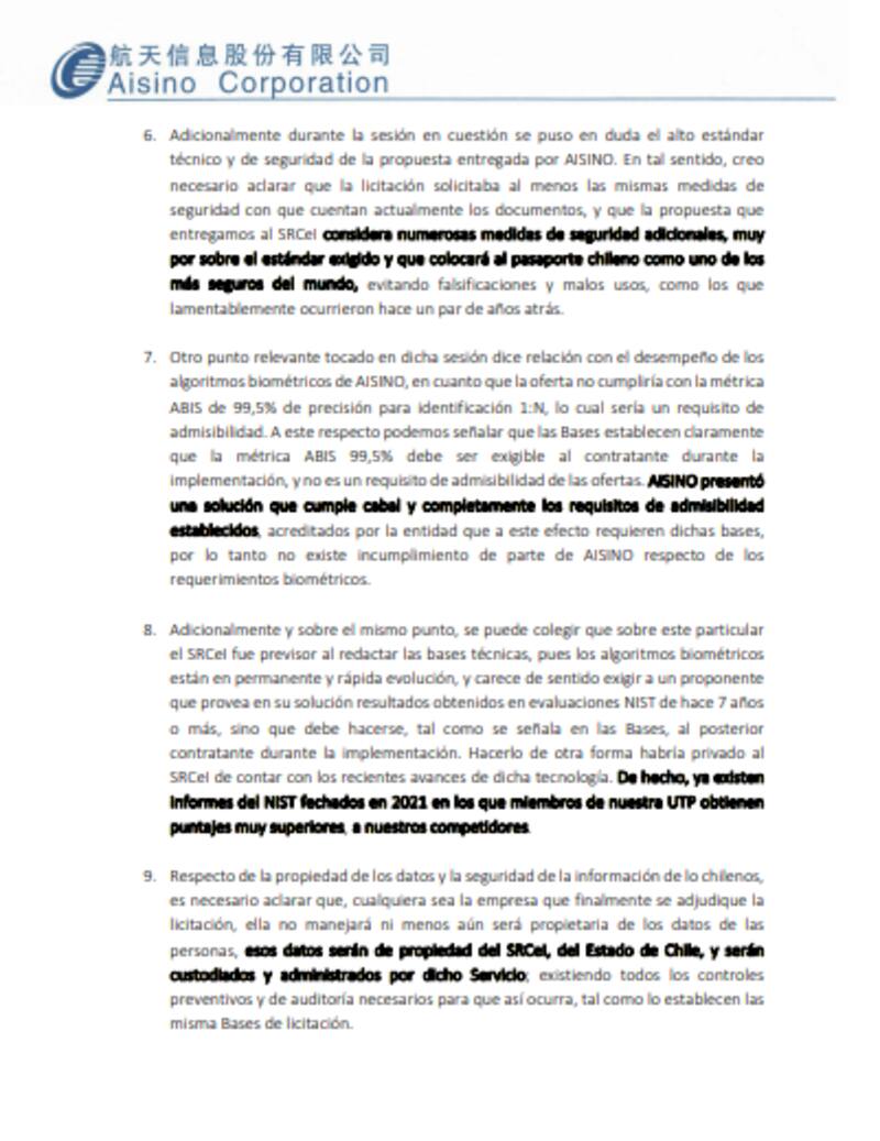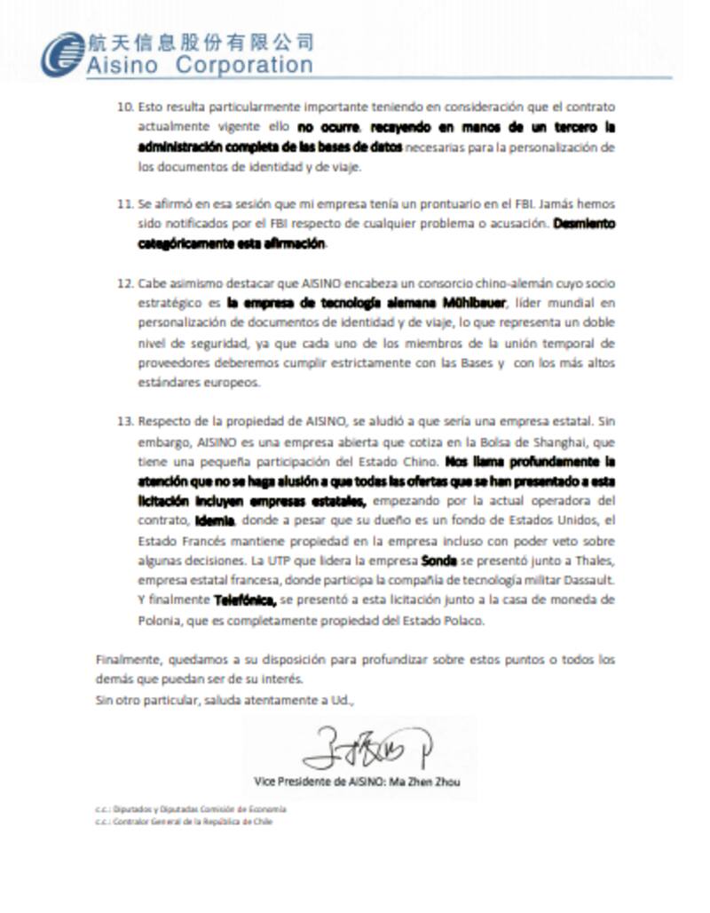 Desde Beijing, el presidente de la empresa asiática, Ma Zhenzhou, envió un documento de cuatro páginas, donde aclara 13 puntos que son parte del cuestionamiento que realizó el parlamentario hacia Aisino y el proceso del Registro Civil. "Cualquiera sea la empresa que finalmente se adjudique la licitación, ella no manejará ni menos aún será propietaria de los datos de las personas", explicó el ejecutivo.