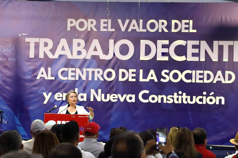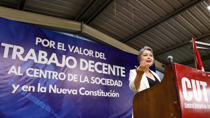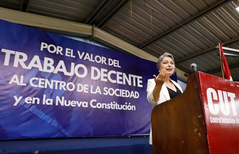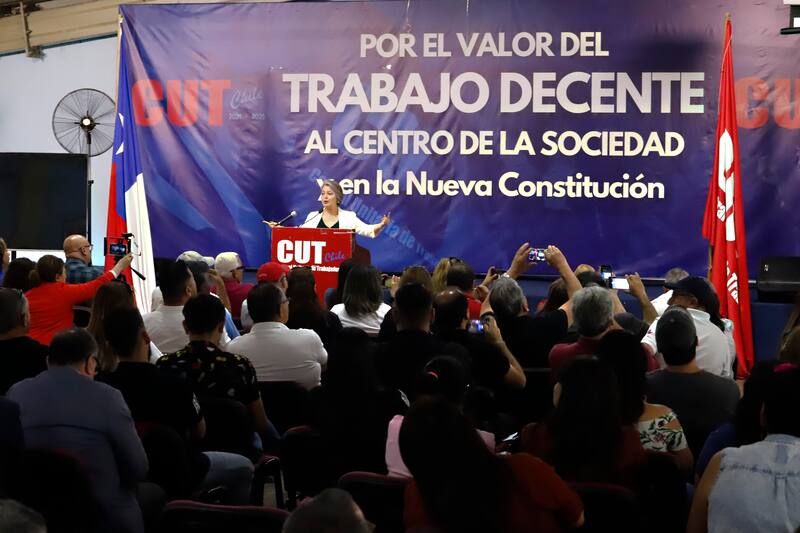 “Ministra, su casa, adelante”, dijeron desde la CUT para presentar a Jara. “Buenos días, cómo están compañeras y compañeros”, comenzó diciendo la ministra antes de empezar su exposición.