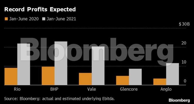 Se espera que las cinco empresas mineras más grandes, entre las que también se incluyen a Glencore Plc, Anglo American Plc y Vale SA, informen un récord de ganancias para el semestre finalizado en junio, según un promedio de estimaciones de analistas compiladas por Bloomberg. Rio podría pagar el 60% de sus ganancias subyacentes, según estimaciones de algunos analistas.
