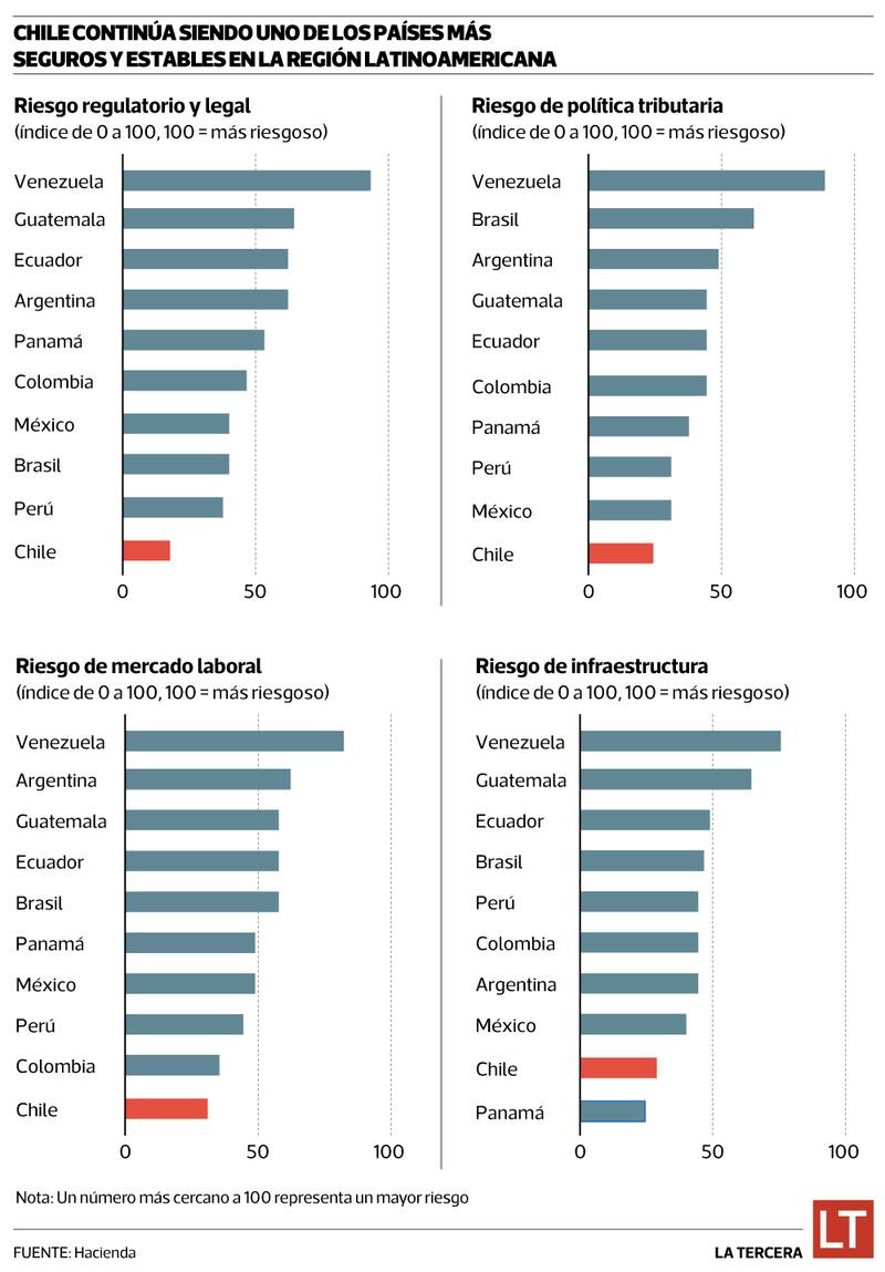 El ministro de Hacienda usó para ello un set de indicadores de la Unidad de Inteligencia del The Economist. En él, en lo que corresponde a riesgo regulatorio y legal, Chile se ubica en la última posición, como el de menor riesgo, por debajo de Perú, Brasil, México. En riesgo de política tributaria, también aparece en la última posición, y lo mismo en riesgo de mercado laboral. Solo en lo que se refiere a riesgo de infraestructura se sitúa en la penúltima posición, estando mejor calificado Panamá.