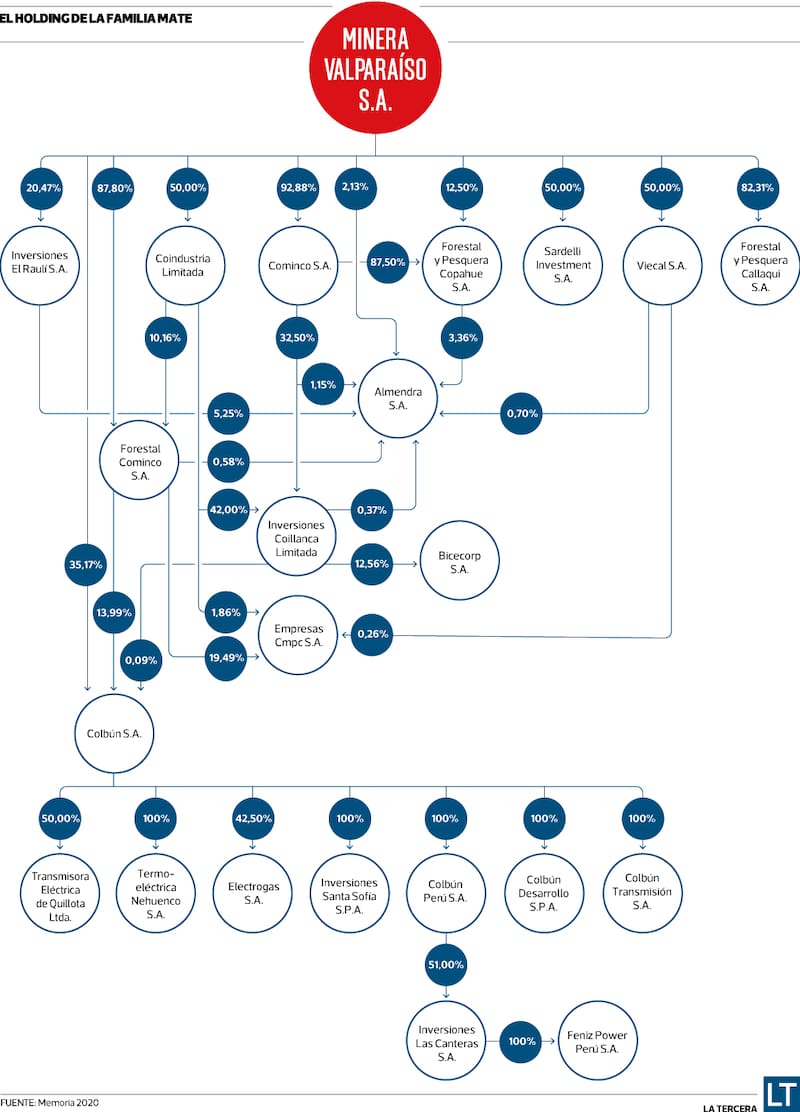 Si bien Minera Valparaíso, donde la familia Matte posee el 88,3783%, funciona como holding de varias compañías, la sociedad controladora de todas las empresas del grupo es Forestal O’Higgins. Con todo, Minera Valparaíso directamente y a través de sus subsidiarias Forestal Cominco e Inversiones Coillanca Limitada, es el accionista controlador de Colbún con un 48,22%, aunque en total la familia Matte posee un 49,96%. Una situación similar es la de Almendral, matriz de Entel, donde MV tiene un 2,13%, pero la familia en su conjunto posee 32,59%. Según la memoria de MV, participa de manera indirecta en Bicecorp, brazo financiero del grupo, con un 6,43%, y con un 19,17% en CMPC.
