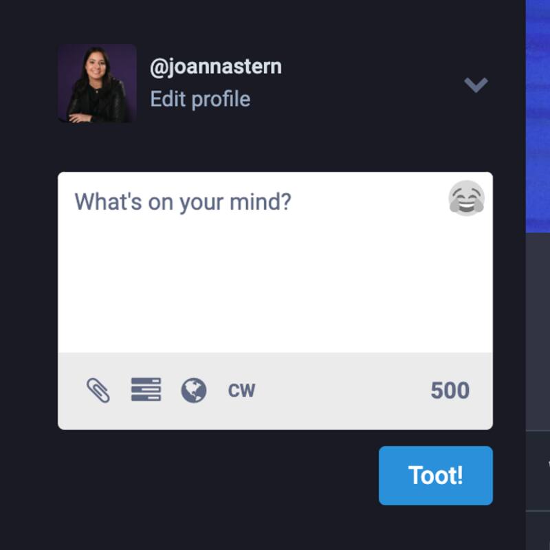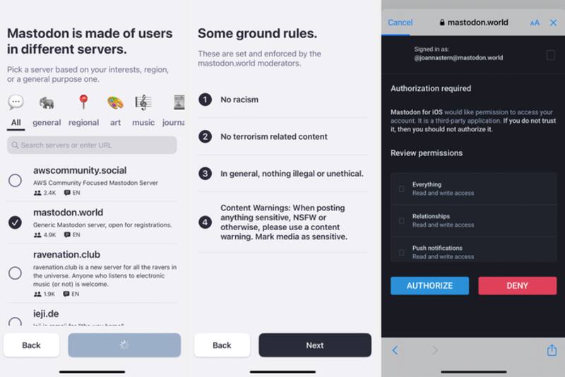 Seleccionas un servidor y luego un nombre de usuario, que juntos forman tu dirección. La mía es @joannastern@mastodon.world. Al igual que el correo electrónico, hay otros que tienen el sufijo @mastodon.world, pero como hay miles de servidores diferentes, hay miles de sufijos diferentes. Algunos populares: mastodon.social, mstdn.social, mastodon.online.