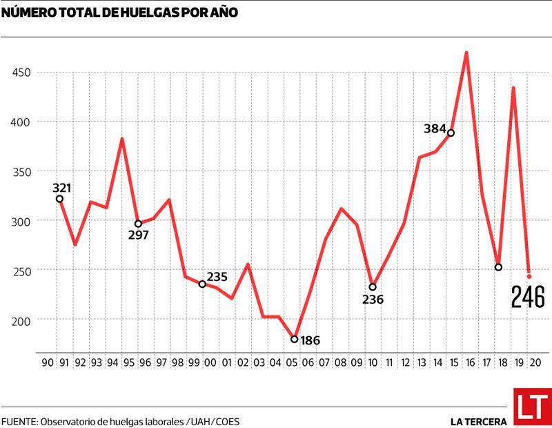 El último estudio del Observatorio de Huelgas Laborales de la Universidad Alberto Hurtado concluyó que el número de huelgas totales descendió casi un 50% entre 2019 y 2020, de 430 a 246. Asimismo, las huelgas que se produjeron en 2020 movilizaron al número más bajo de trabajadores en los últimos 30 años: 42.542.