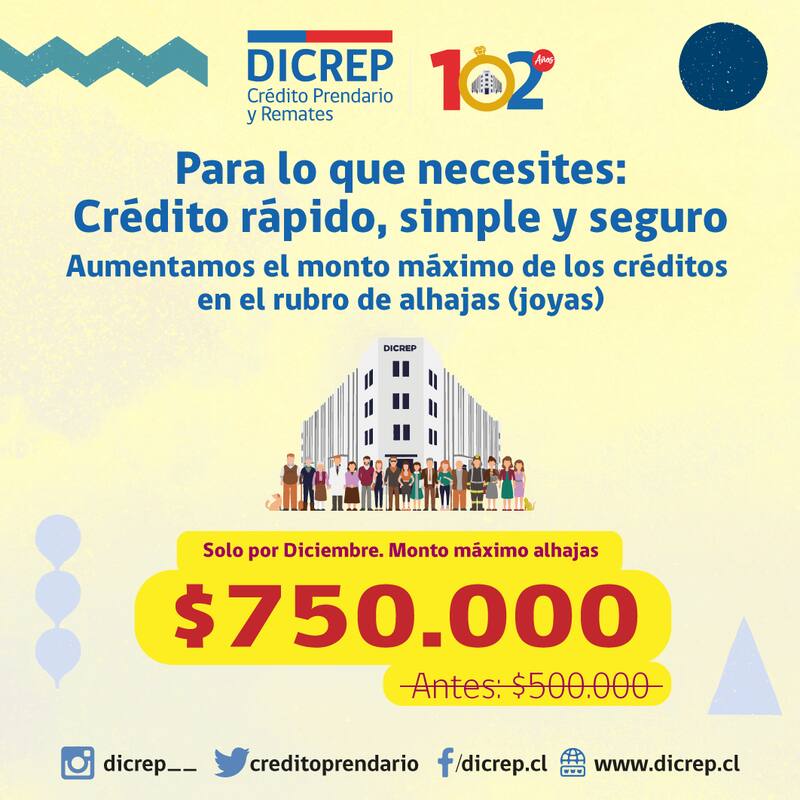 Cabe recordar que la Dicrep entrega dos tipos de créditos: uno en que se prendan alhajas, cuyo monto normalmente tiene como máximo los $500 mil; y otro donde se pueden empeñar por hasta $200 mil una serie de objetos como artículos tecnológicos, electrodomésticos o cámaras fotográficas de última generación, entre otros.