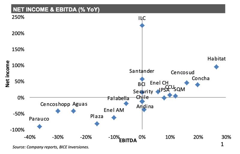 “Esperamos un aumento del EBITDA de 8.0% año contra año. Destacamos ILC ( alza de 223.6% año contra año en ingresos netos) relacionado con un crecimiento significativo en las utilidades de las subsidiarias Habitat y Consalud, impulsado principalmente por mayores retornos de sus carteras de inversión y baja base comparable”, indica BICE. CAP continuará mostrando un fuerte crecimiento en el EBITDA (+54% año contra año) y en ingresos netos relacionados con el aumento de los precios del mineral de hierro, la normalización del costo en efectivo en la subsidiaria “CMP” y una base comparable baja”, dice BICE.