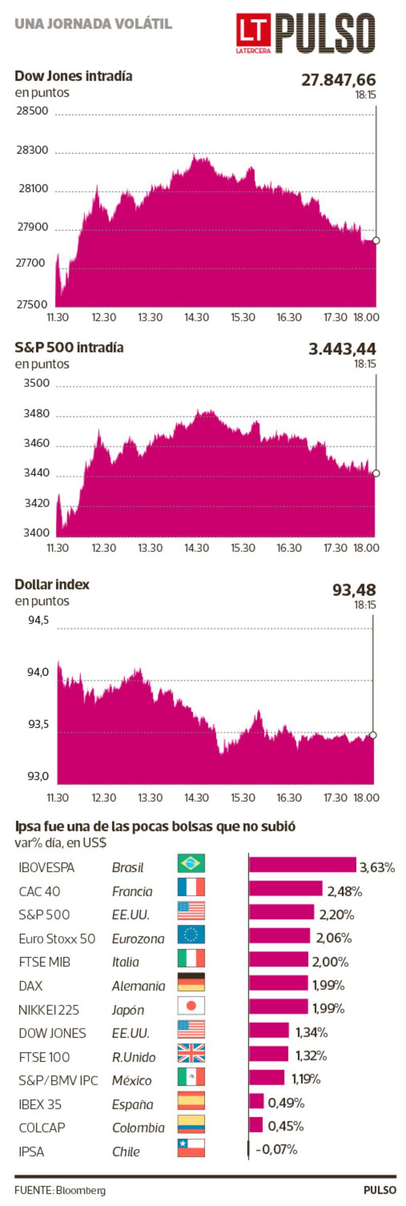En plano local, la Bolsa de Santiago reflejó el clima de nerviosismo y cautela, perdiendo 0,1%, y con el dólar que trepó $2,68 hasta los $$757,78.
