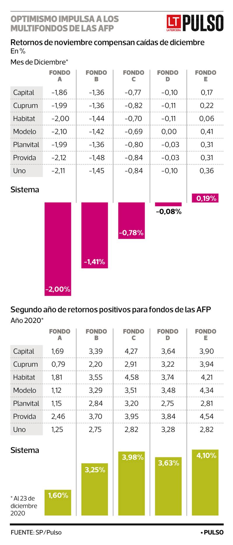 Según datos de la Superintendencia de Pensiones al 23 de diciembre, tanto los fondos de mayor riesgo como los más conservadores, no solo sortearon la crisis por coronavirus, sino también la volatilidad que reinó en el mercado local ante el proceso para una nueva Constitución. (Ver gráficos)
