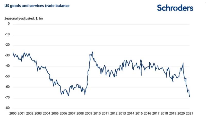 El deterioro de la balanza comercial de Estados Unidos es otro factor que explica la visión del head de Estrategia Global de EMD de Schroders, pues actualmente se ubica en niveles cercanos a los apuntados en la década de 2000, cuando el dólar marcó mínimos. (Ver gráfico)
