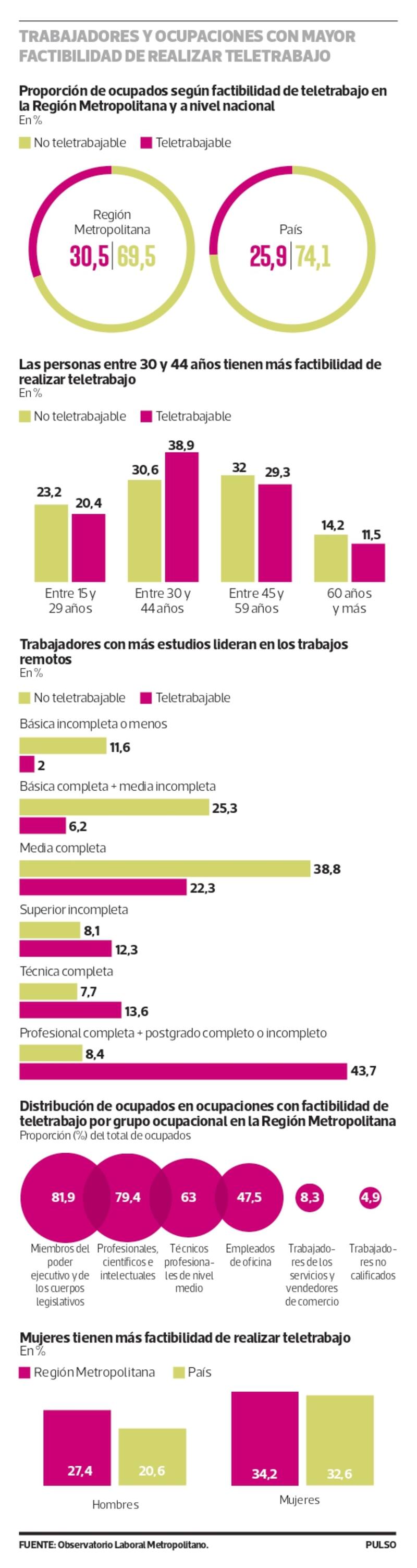 Pero ¿cuáles son las ocupaciones que tienen una mayor factibilidad de seguir funcionando de manera remota? Esa respuesta la entrega el estudio “Factibilidad y determinantes del teletrabajo a nivel de ocupaciones en Chile”, realizado por el Observatorio Laboral de la Región Metropolitana - iniciativa del Sence de la RM y ejecutado por el Centro de Políticas Públicas de la UC y la OTIC Sofofa- donde señala que el 25,6% de los ocupados totales se desempeña en labores que se pueden mantener de manera remota, lo que representa casi 2 millones de personas.