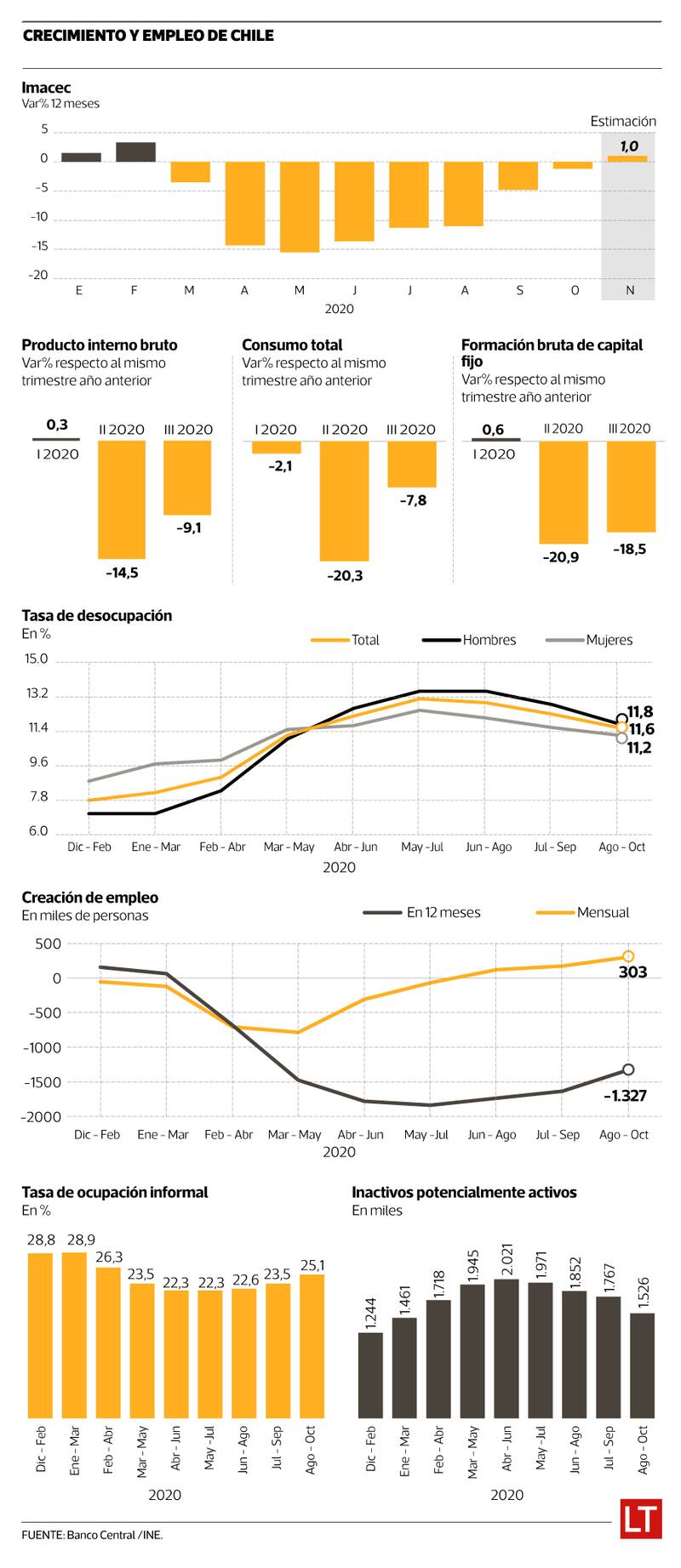 Se esperaba que en el último trimestre, la actividad pudiera mostrar cifras azules. Eso hasta conocer el Índice Mensual de Actividad Económica (Imacec) de octubre. La caída de 1,2% no estaba en el escenario de ningún analista y enfrío las perspectivas para el año. Tanto así, que el propio Banco Central, en su último Informe de Política Monetaria (IPoM) de diciembre, recortó su proyección de crecimiento pasando del rango -5,5 / -4,5% a uno entre -6,25 / -5,75%, como corolario del año.