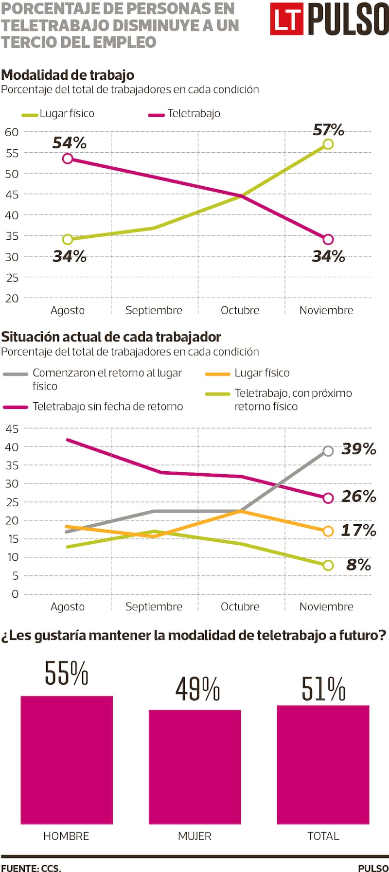 Visto del lado de quienes teletrabajan, las personas que declaran mantenerse en modalidad de trabajo a distancia total o parcial, disminuyeron desde un 54% del total en agosto, a un 34% en diciembre.
