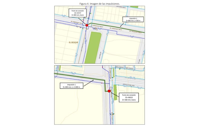 Se estiman dos impulsiones: la primera será de 800 mm de diámetro y se desplazará al oriente por Avenida Observatorio hasta Avenida Santa Rosa, donde se conectará a una red existente; la segunda tendrá 800 mm también y se direccionará al poniente por Avenida Observatorio hasta la calle San Francisco, allí se unirá a una red existente. En los dos trazados se deberá ejecutar rotura y reposición de pavimentos.