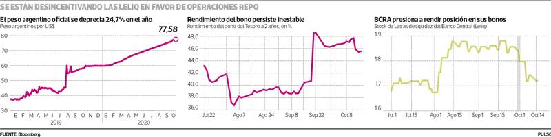Esto se suma a esfuerzos ya en curso, como el inducir a los bancos a colocar el exceso de liquidez en repos de uno o siete días, en desmedro de las Letras de liquidez del Banco Central (Leliq), lo que ha hecho subir la tasa de la primera y bajado la de la segunda desde el 1 de octubre.