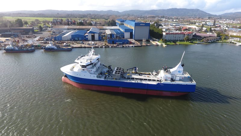 En 2023, Asenav cerró con órdenes de construcción por US$150 millones, contratos que consideran -entre otros- un barco para transportar peces vivos (wellboats, en jerga técnica) con capacidad para 3 mil metros cúbicos, que la industria salmonera chilena tenía antes que mandar a fabricar a Noruega o España. “Es el primero de esa capacidad que se hace en Chile”, agrega el ejecutivo, mientras describe las características de la nave bautizada como Patagon XI y que fue completamente diseñada en el país.