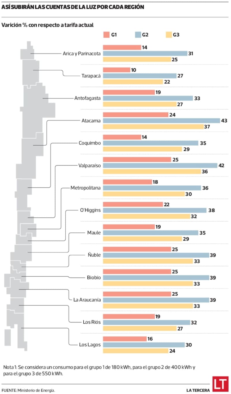 El segmento de mayor consumo, en tanto, tendrá alzas de entre 24%, en Los Lagos, y llegará a un aumento máximo en las mismas regiones del consumo medio: Valparaíso (36%) y Atacama (37%).