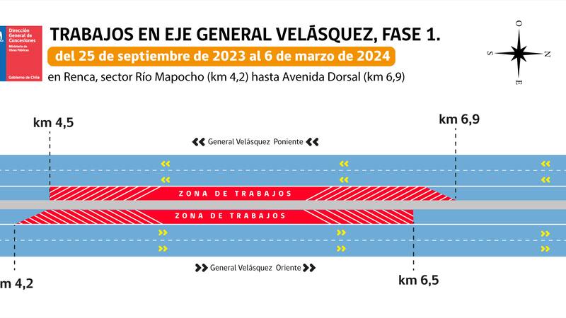 Atención a los automovilistas, ya que a partir del lunes 25 de septiembre comienzan trabajos de ampliación a terceras pistas en Avenida General Velásquez, en el sector entre el Puente Gran Envergadura -que se ubica en el sector del Río Mapocho al norte (km 4,4)- y hasta la altura de Avenida Dorsal (km 6,5), en la comuna de Renca. Esto tiene la finalidad de mejorar los tiempos de traslado en horarios de mayor afluencia. Los trabajos se extenderán por nueve meses, según indicó la Dirección general de concesiones en un comunicado.
