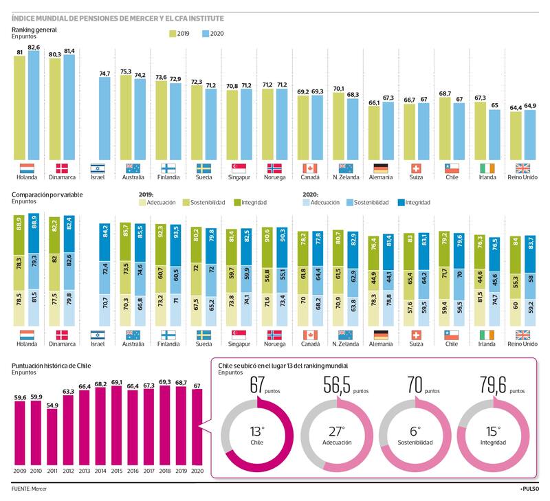Sale del top 10 global, pero sigue liderando en Latam. Esto ocurrió porque el puntaje del país bajó desde 68,7 a 67, principalmente por un retroceso en la tasa de reemplazo, y una disminución en el crecimiento económico para 2020. De todas maneras, acá no se alcanzó a reflejar el retiro del 10% de las AFP, por lo que en la próxima medición se vería el efecto.