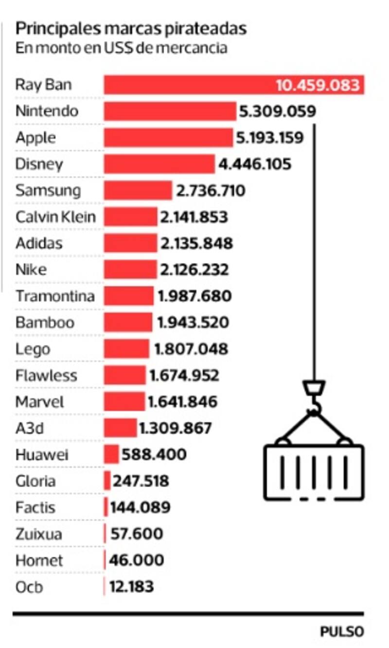 Las marcas decomisadas más pirateadas durante el año fueron Ray Ban (US$10 millones), Nintendo (US$5,3 millones), Apple (US$5,2 millones), Disney (US$4,4 millones) y Samsung (US$2,7 millones).