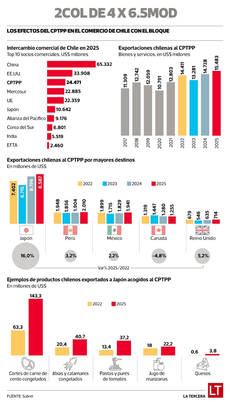 El balance del tercer año de la entrada en vigor del Tratado Integral y Progresista de Asociación Transpacífico (CPTPP, por sus siglas en inglés, pero conocido también comúnmente como TPP11) trae novedades positivas para el comercio exterior chileno. Un estudio de la Subsecretaría de Relaciones Económicas Internacionales (Subrei) reveló que las exportaciones nacionales al bloque ascendieron a US$ 15.483 millones en 2025, un alza de 5,1% respecto al año anterior y el mayor nivel desde la creación del acuerdo.