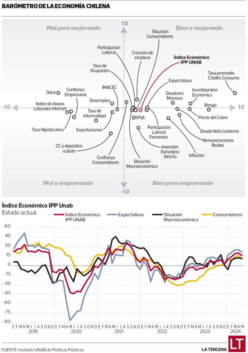 En el subíndice de situación macroeconómica se experimentaron dos cambios, ambos negativos. Por un lado, las exportaciones pasaron del mejor de los cuadrantes al peor, de “bien y mejorando” a “mal y empeorando”. Y por el otro, el precio del cobre se movió desde “bien y mejorando” a “bien, pero empeorando”.